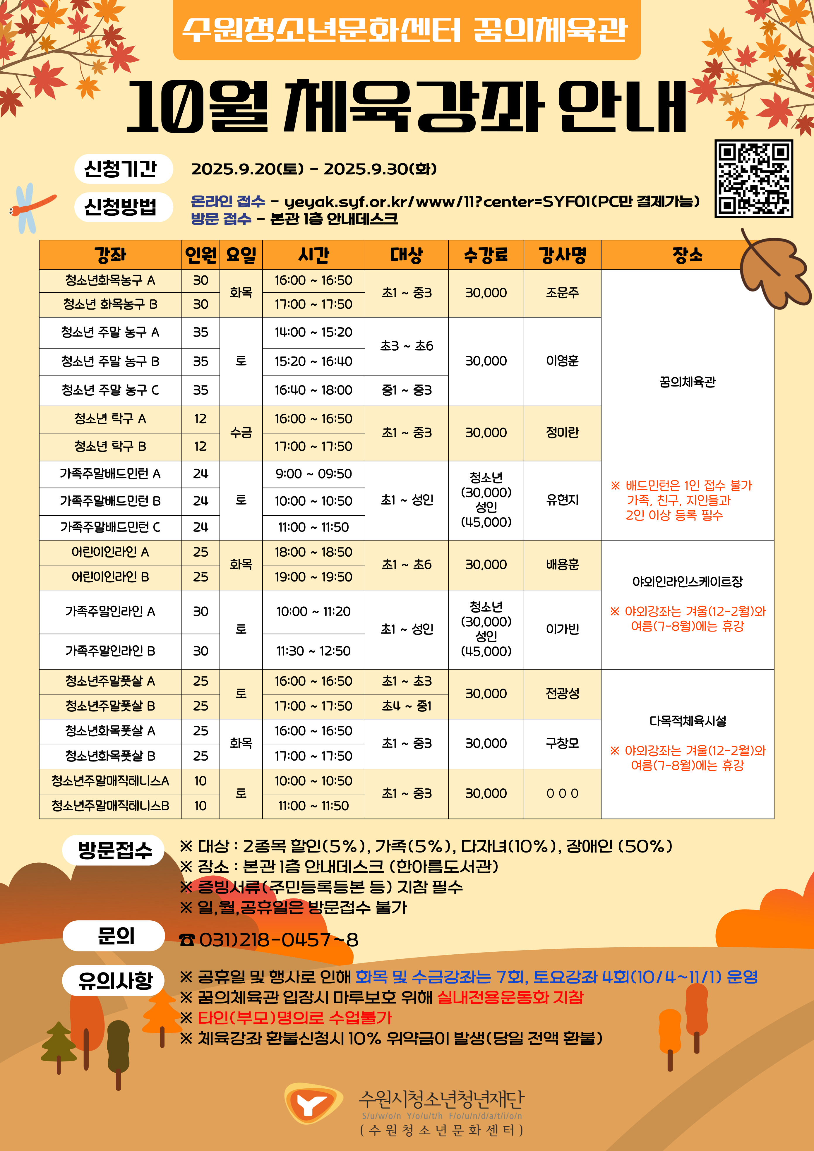 [수원청소년문화센터 10월 체육강좌 접수안내]